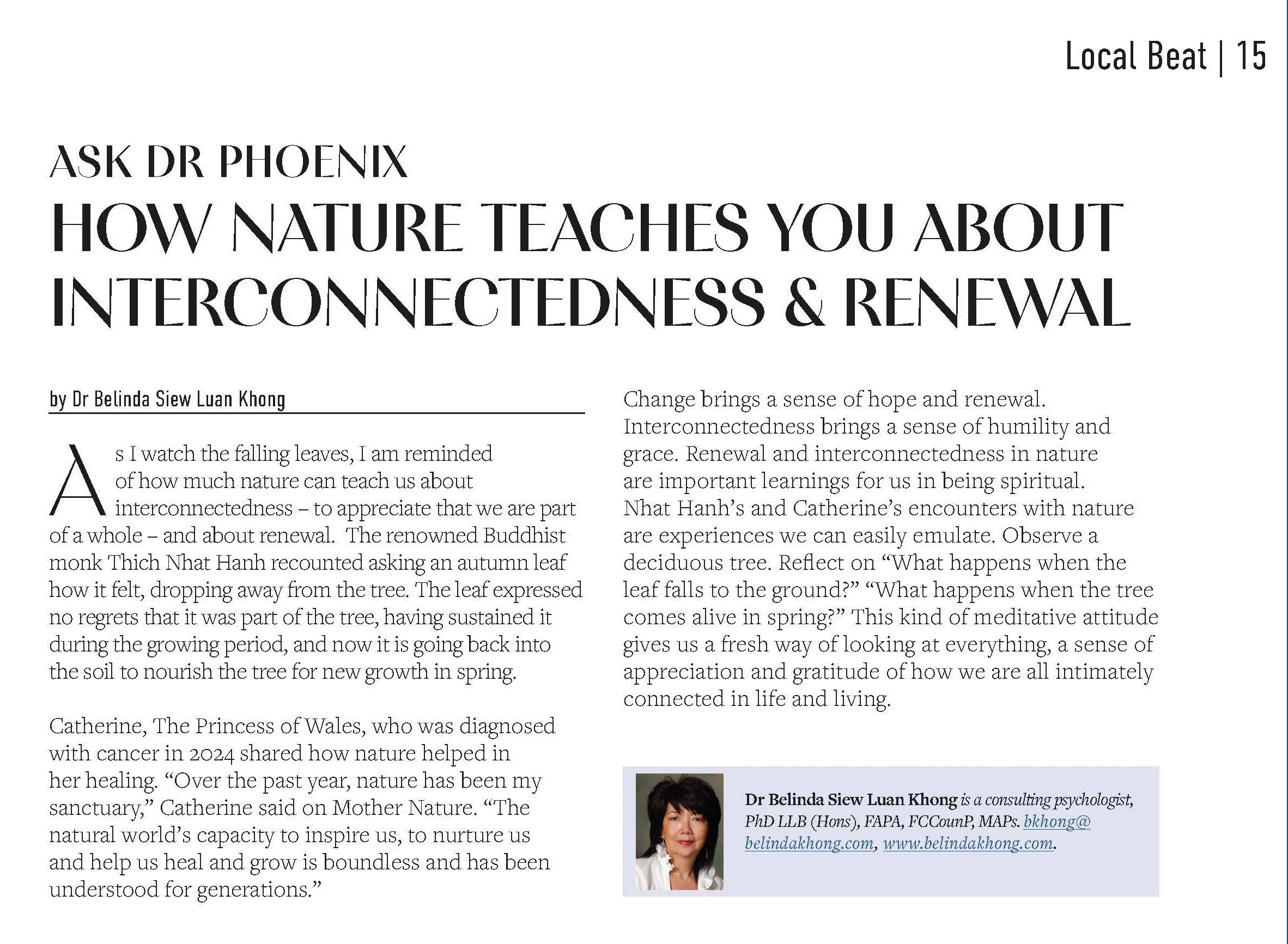 I write about the renowned Buddhist monk, Thich Nhat Hanh’s conversation with the fallen autumn leaves, with the leaves expressing no fear or regrets since it was part of the whole tree, having nourished it in its growth, and now goes back to the soil to nourish the tree for its renewal in spring – a wonderful illustration of inter-connectedness and inter-dependence.